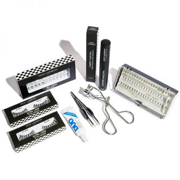 מארז ריסים הורסים המכיל 4 חבילות ריסים, פינצטה להדבקת ריסים, דבק ריסים DUO מקצועי ומסקרה וומפיר.
